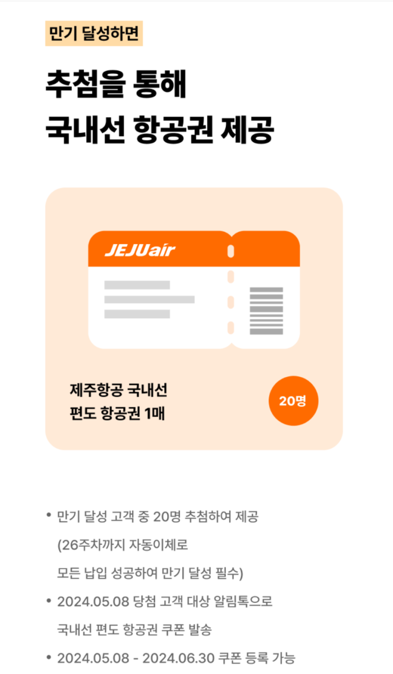26주 연속으로 자동이체 납입에 성공하면 제주항공의 멤버십 포인트와 항공운임 할인 쿠폰, 롯데면세점의 온·오프라인 할인 쿠폰 등 다양한 혜택을 받을 수 있습니다. 26주차까지 자동이체 납입에 성공해 만기를 달성한 고객 중 20명을 추첨해 제주항공 국내선 편도 항공권도 제공합니다.