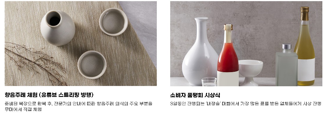 | 14:00 ~ 15:00 | 개막식 및 우리술 품평회 시상식 | - | (2차)우리술 역량 강화 공개 컨설팅 | 나만의 라벨 만들기 | (4차)우리술 역량 강화 공개 컨설팅 | 나만의 칠링백 만들기 |