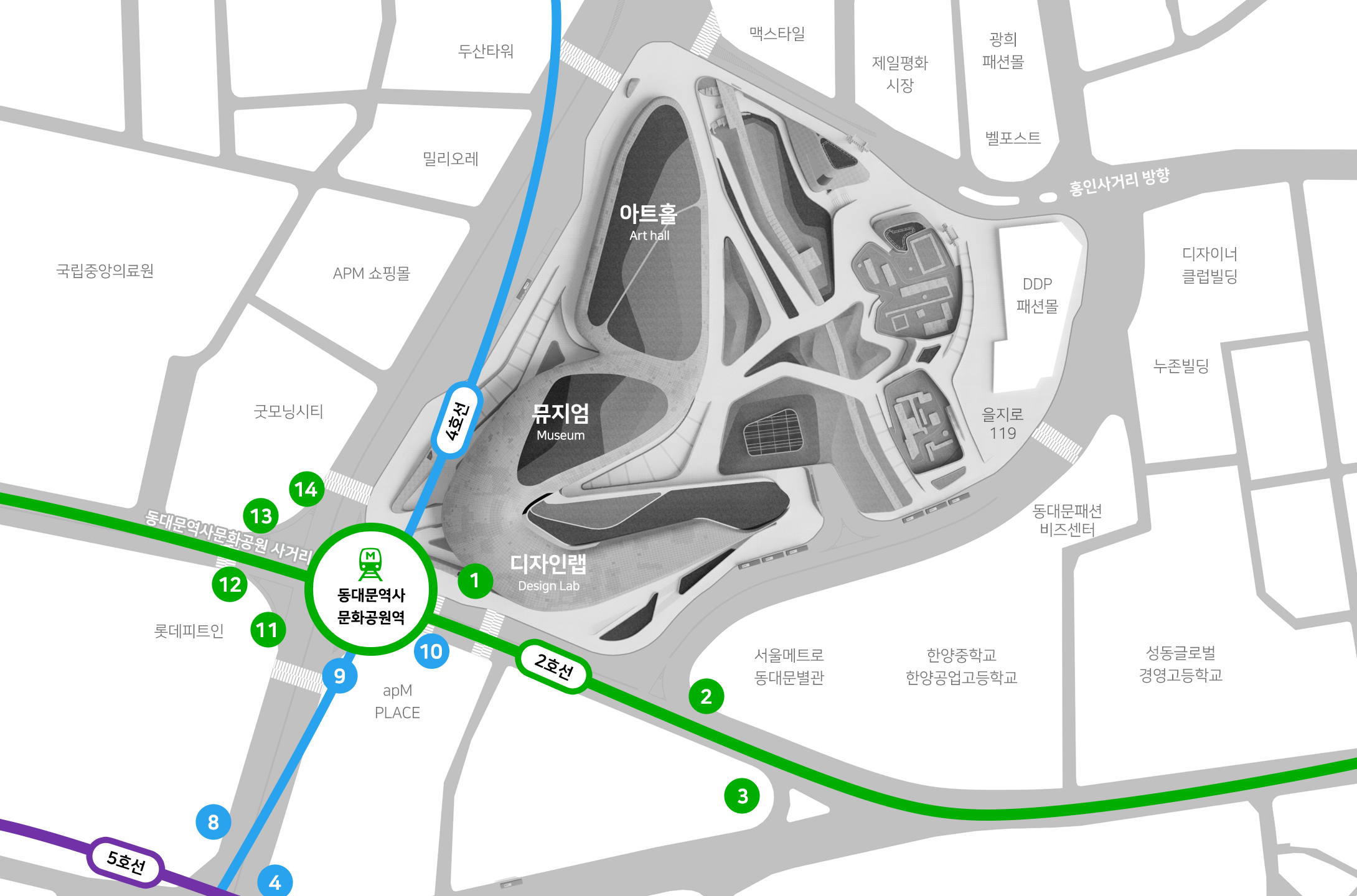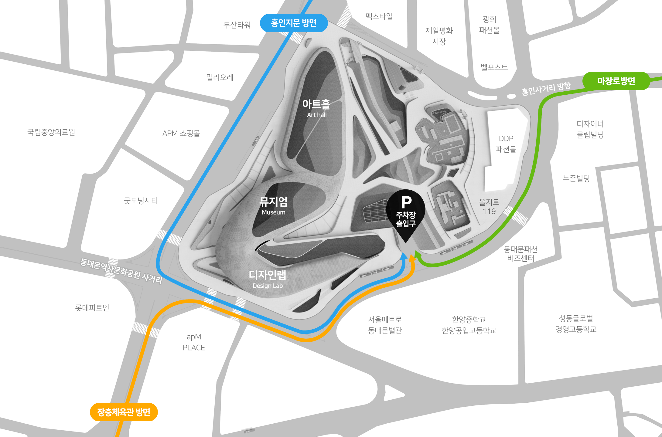 광희동 사거리를 지나 동대문역사문화공원사거리에서 신당역, 충무아트홀 방면으로 우회전 → 을지로 45길로 약 200m 직진 → DDP 지하 주차장 진입