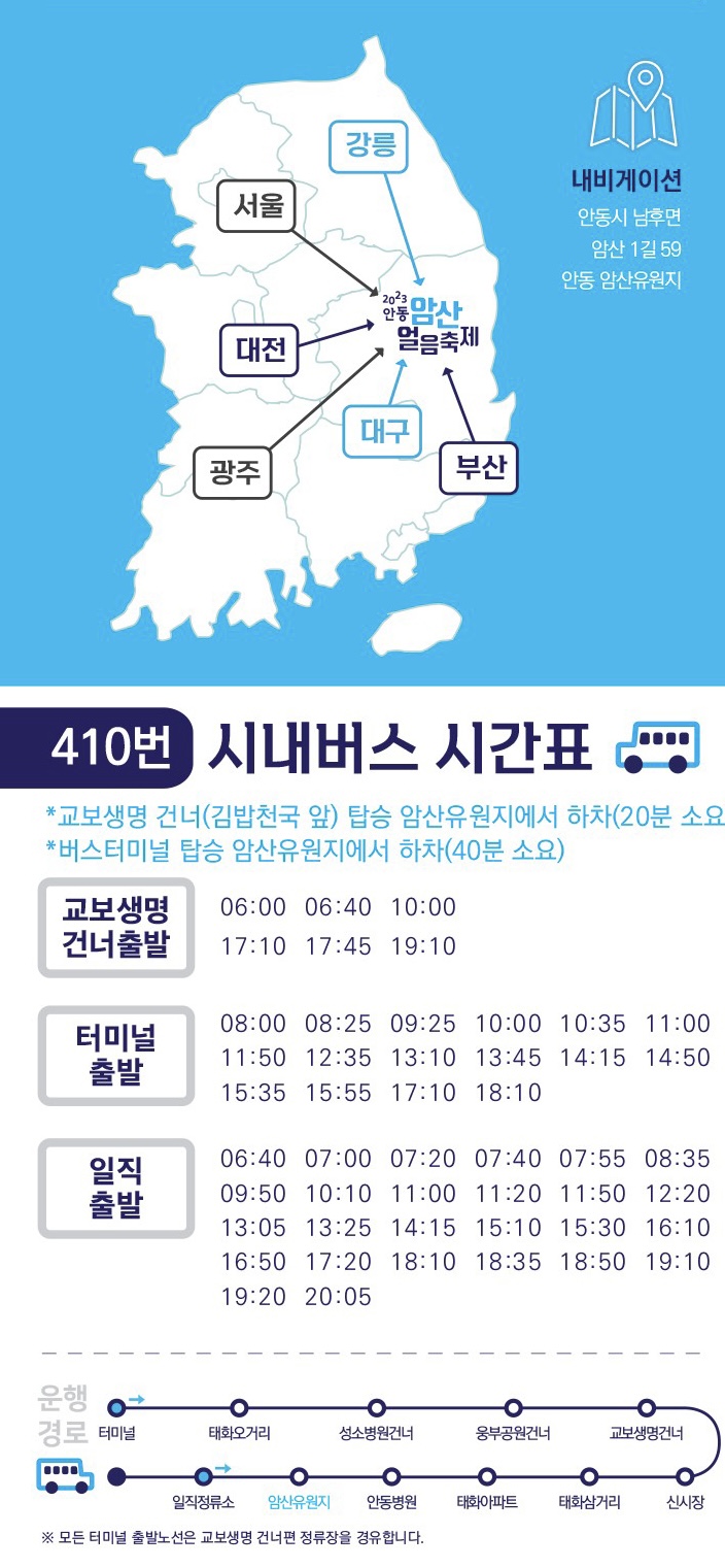 천혜의 자연 절경을 고스란히 간직한 안동 암산유원지에서 펼쳐지는 영남 최대 겨울축제!로 여러분을 초대합니다.