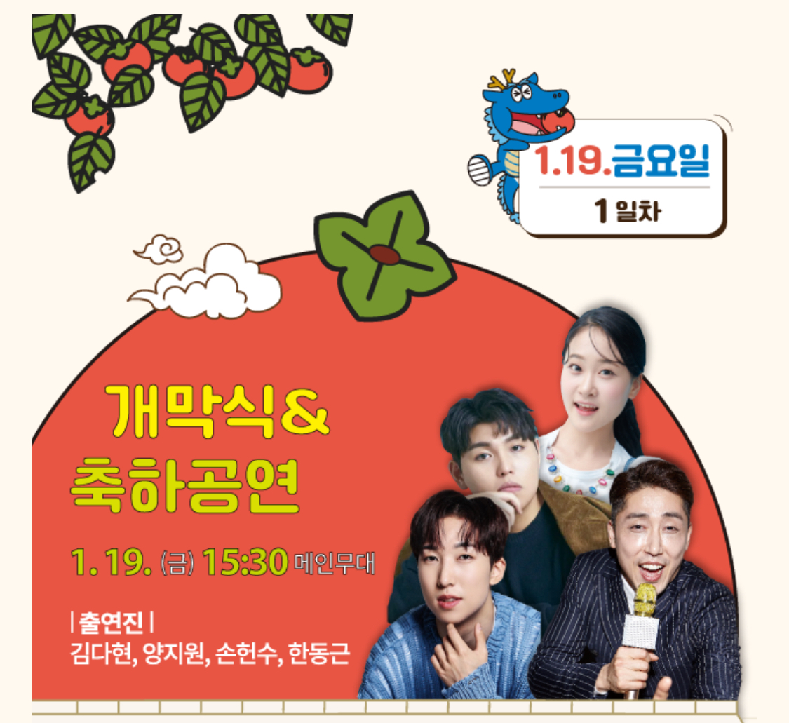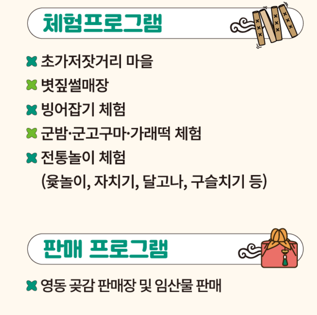 체험행사 :볏짚썰매장, 군밤체험, 곶감따기체험, 전통놀이체험, 저잣거리놀이터, 곶감만들기 등