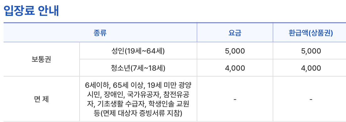 ※ 면제대상 : 6세 이하, 65세 이상, 19세 미만 광양시민, 장애인, 국가유공자, 참전유공자, 기초생활 수급자, 학생인솔 교원 등(면제 대상자 증빙서류 지참)