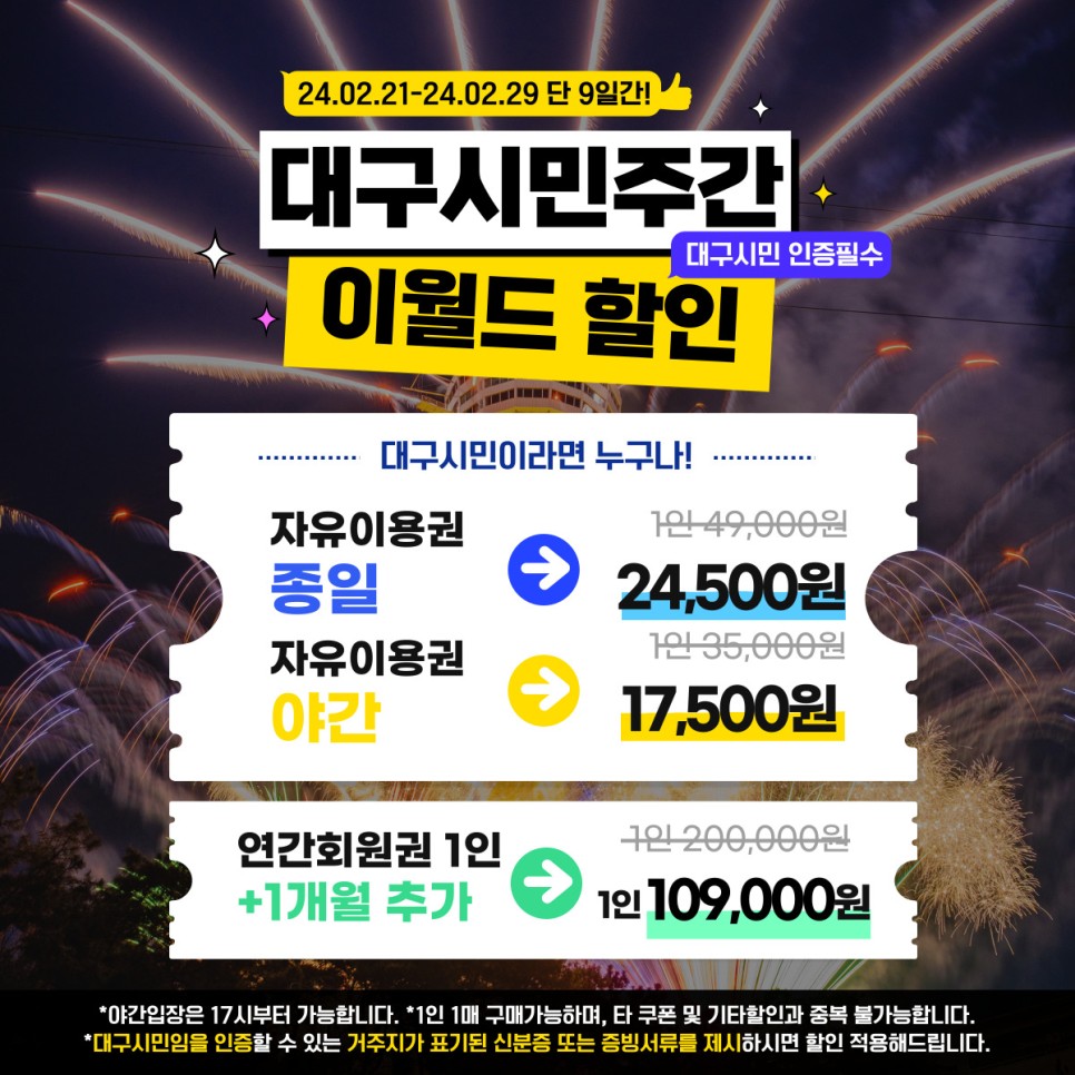 ○ 야간 자유이용권 : 대인 35,000원 / 청소년 33,000원 / 어린이 33,000원