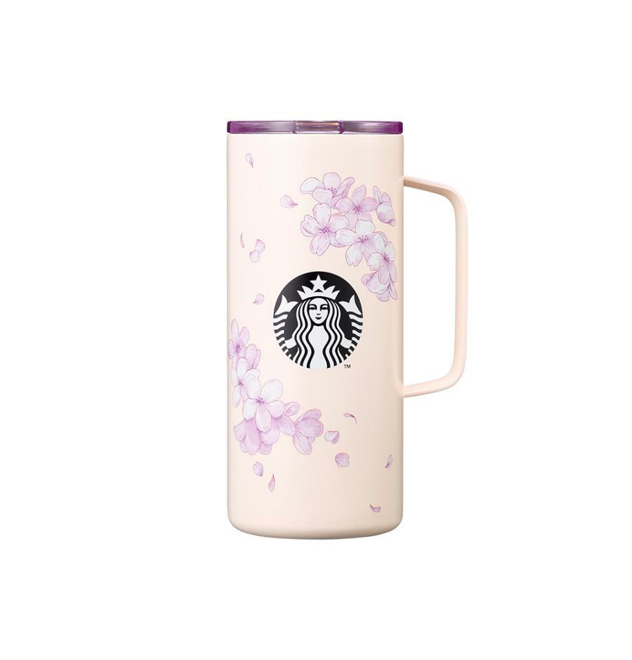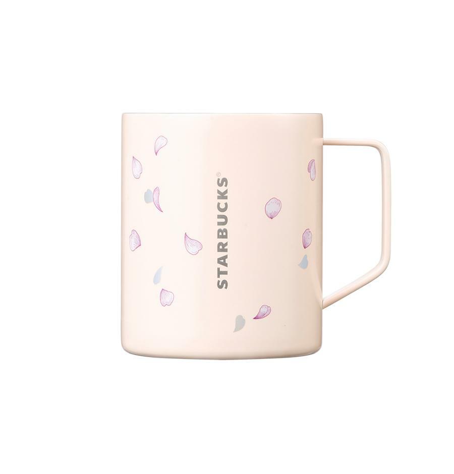 흩날리는 벚꽃의 모습을 담은 414ml 용량의 스테인리스 스틸 머그입니다.