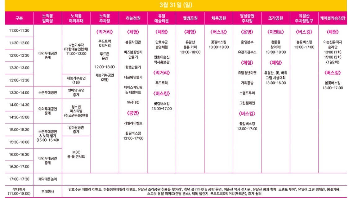 유달산의 봄과 이순신 및 수군 콘텐츠를 활용한 참여형 프로그램들로 수군퍼레이드, 4·8만세운동 재현, 사랑의 노적쌓기, 수군병영체험, 유달산 꽃길버스킹 등 다채로운 볼거리와 특색있는 먹거리, 플리마켓, 문화예술 공연, 체험·전시 프로그램으로 이루어집니다.