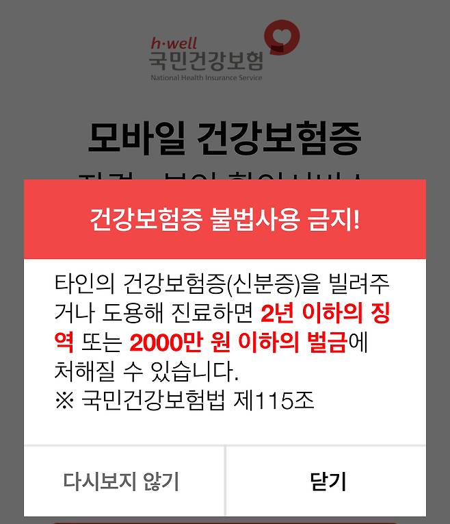 모바일 건강보험증은 본인확인 인증을 받아 발급받을 수 있습니다. 병의원을 방문할 때는 모바일 건강보험증으로 진료를 접수하세요.