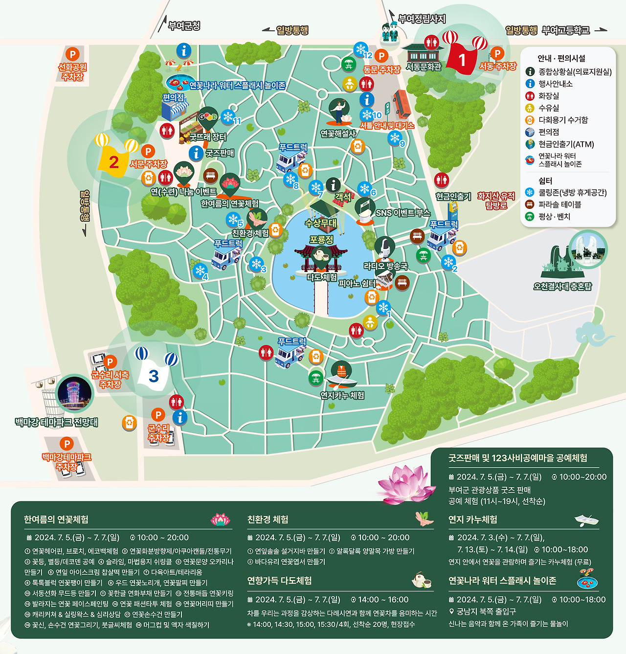 제22회 부여서동연꽃축제로 여러분을 초대합니다! 기 간 2024. 7. 5(금) ~ 7. 7(일) 경관 및 편의시설 운영 6. 29 ~ 7. 31 장 소 충청남도 부여군 서동공원(궁남지) 일원