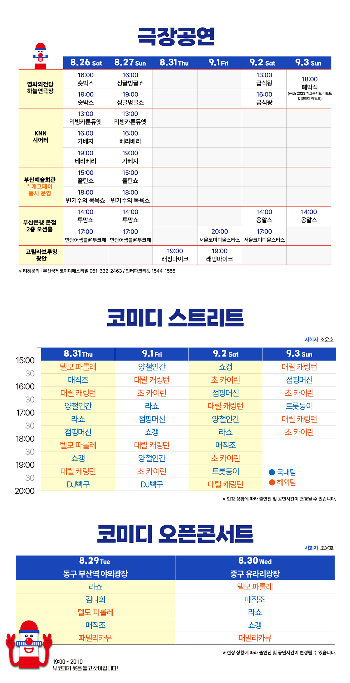 2013년 아시아 최초 코미디페스티벌로 시작한 부산국제코미디페스티벌은 명실상부 부산을 나아가 대한민국을 넘어 아시아를 대표하는 페스티벌로 자리 잡았습니다. 세계적인 해외 코미디 아티스트들과 국내 유명 코미디언들이 펼치는 다양하고 수준 높은 코미디공연,