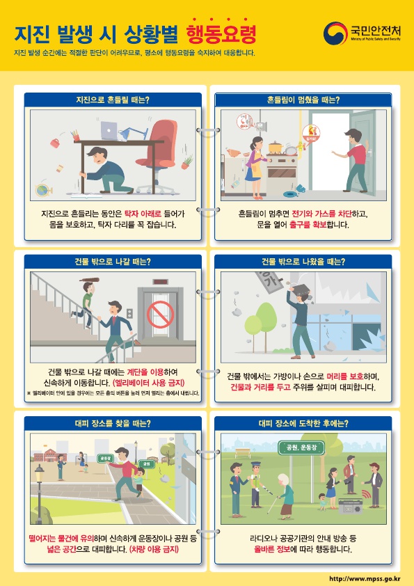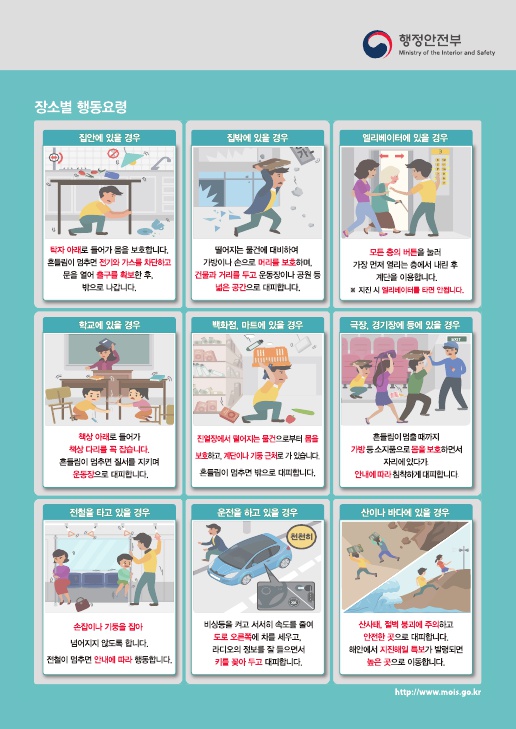 ∙ 근거 없는 유언비어에 유의하고, TV‧라디오나 공공기관에서 제공하는 정보를 확인하여 지진 국민행동요령에 따릅니다.